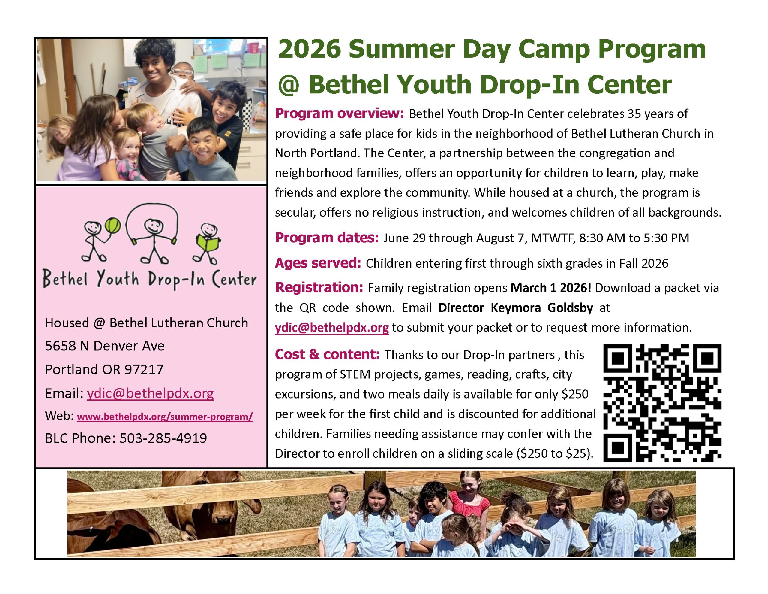 The Bethel Youth Drop-In Center partners with Bethel Lutheran Church at 5658 N Denver Ave, Portland OR 97217, to operate a six-week Summer Day Camp Program for children entering first through sixth grade. The 2026 Day Camp will be in session 8:30 AM to 5:30 PM from June 29 through August 7 — our 30th season. The Center is a partnership between Bethel Lutheran Congregation and neighborhood families, offering a safe space for children to learn, play, make friends, and explore adventures in the community. While housed at a church, the program is secular, offers no religious instruction, and welcomes children of all backgrounds. Contact the Center by email at ydic@bethelpdx.org (attention Director Keymora Goldsby)