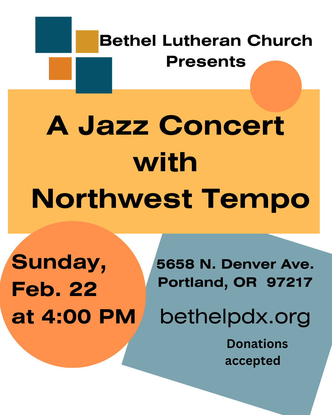 Join with the Bethel Community for a free jazz concert every 4th Sunday at 4pm in the Bethel sanctuary. Our friends Northwest Tempo have a rotating roster of jazz musicians that play all sorts of jazz standards. There are free refreshments provided, and any donations received go to pay our talented musicians.